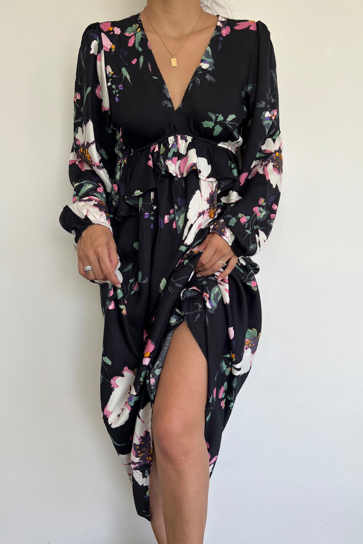 Çiçek ve Yaprak Desenli Uzun Kollu Elbise SİYAH