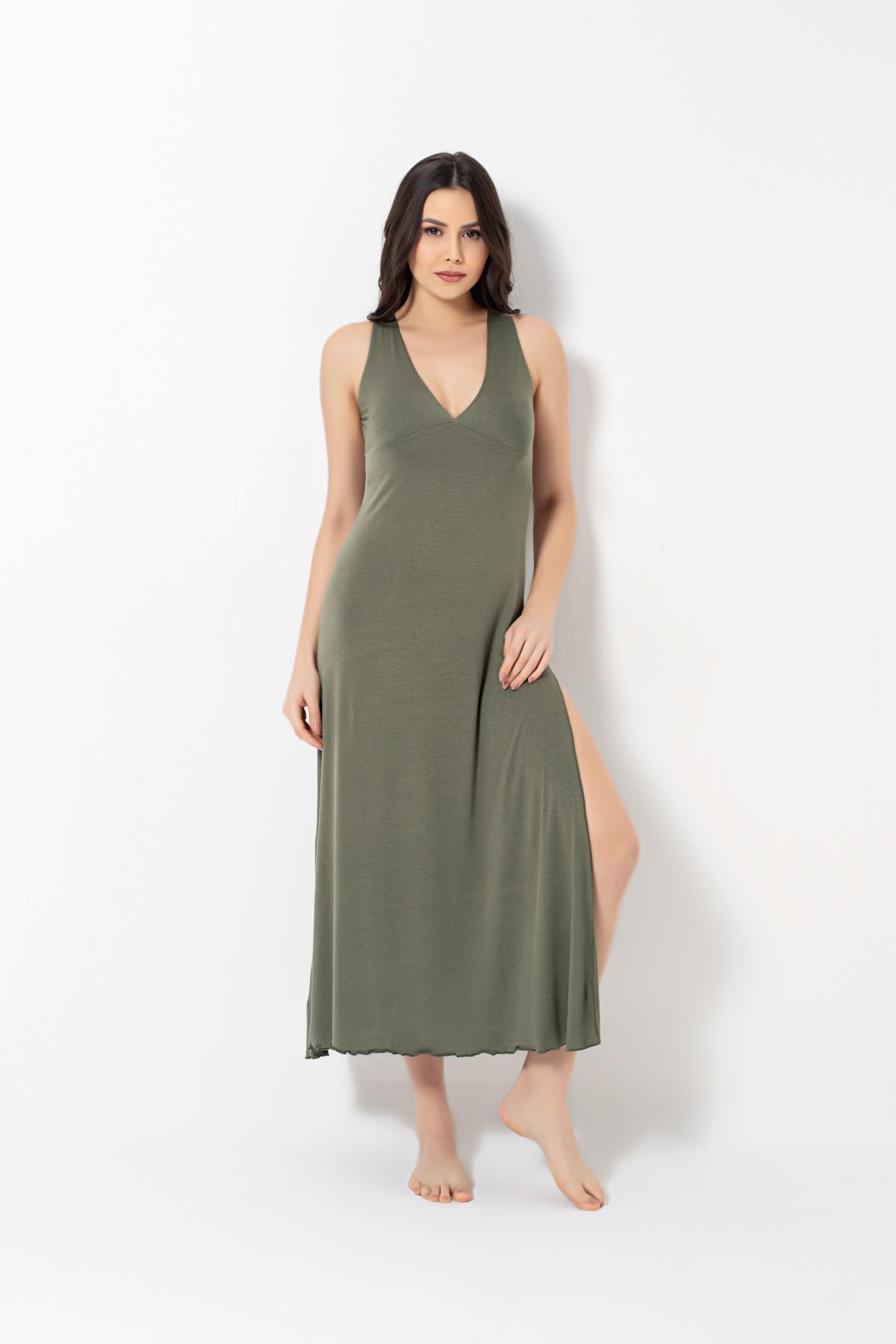 Göğüs ve Sırt Dekoteli Brode Dantelli Yırtmaçlı Gecelik HAKİ (MON18K18485)