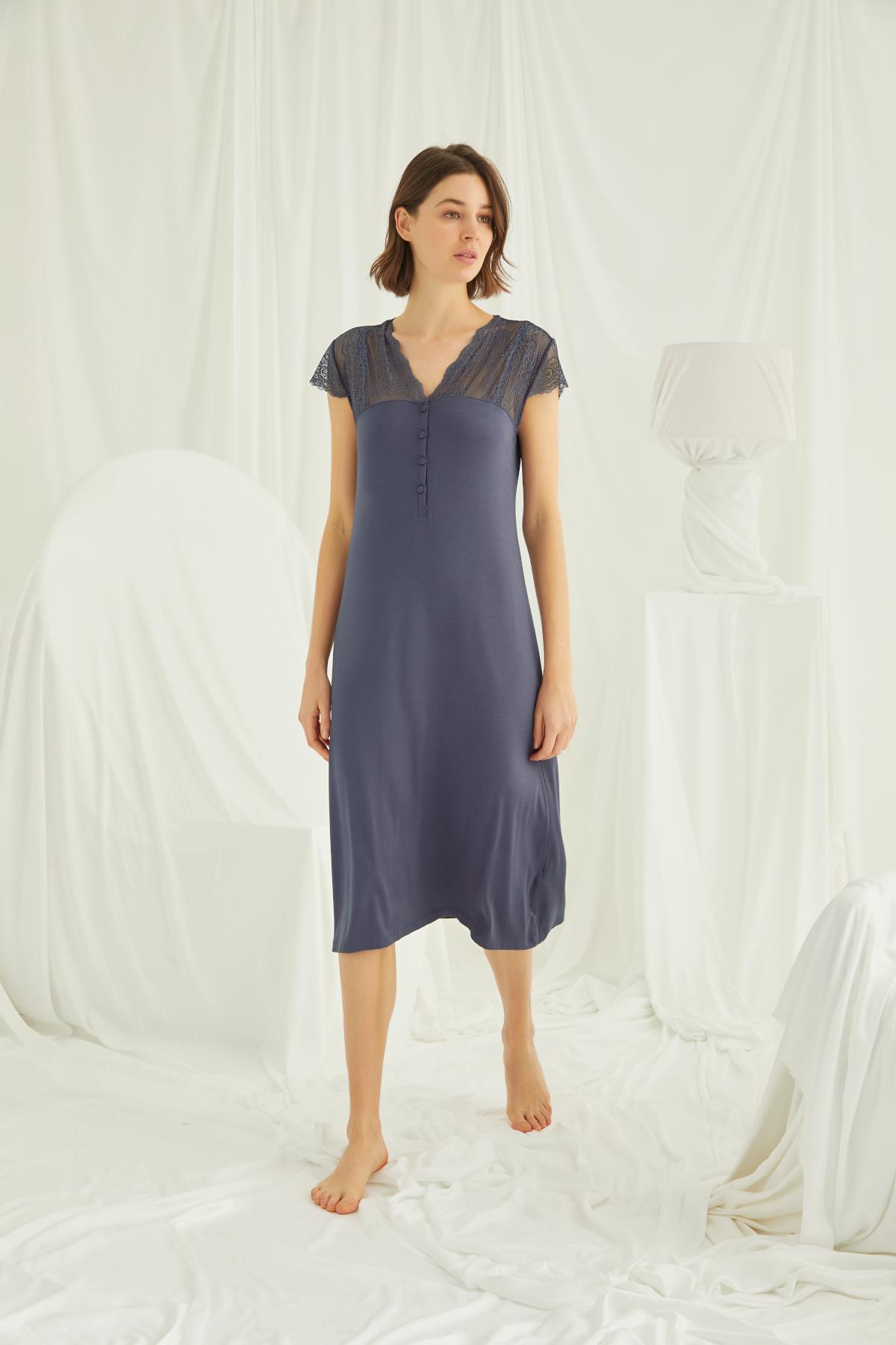 Kolu Omzu ve Yakası Dantelli Önü Düğmeli Gecelik LACİVERT (MON18K18404)