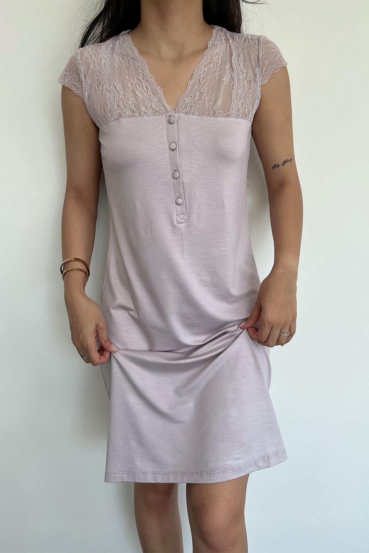 Kolu Omzu ve Yakası Dantelli Önü Düğmeli Gecelik VİZON (MON18K18435)